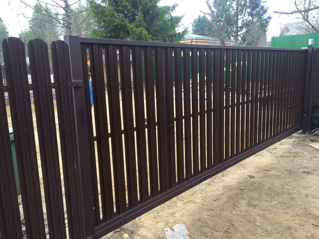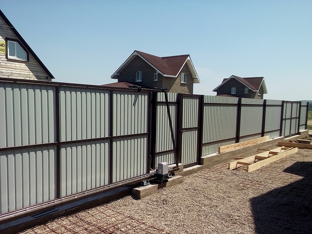 Ворота откатные автоматические с приводом из евроштакетника на бетонном основании